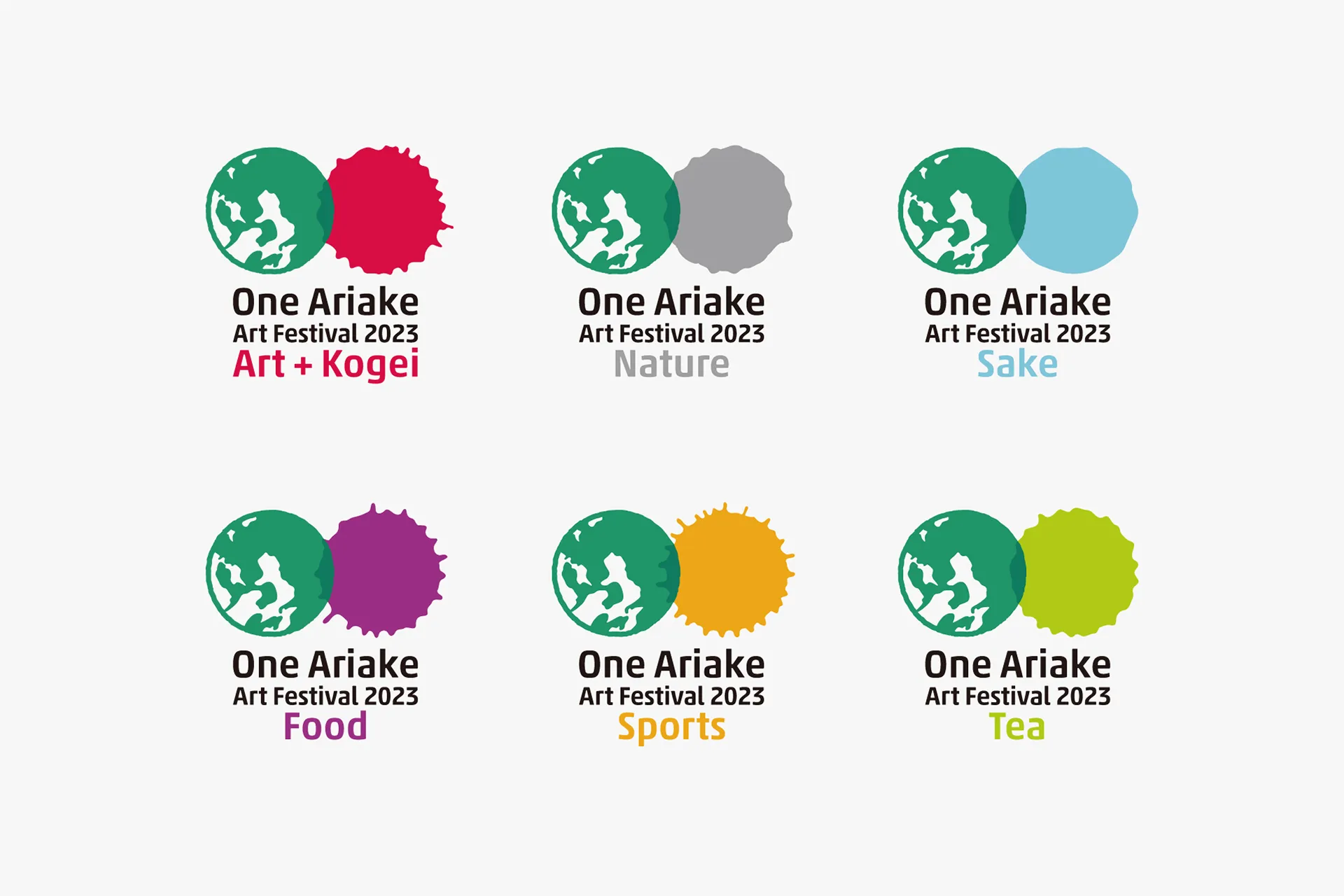 ONE有明アートフェスティバルのロゴは、2つの図形で成り立っています。緑の図形は「環有明地域の調和」「陸の豊かさ」を、青い図形は「新しい文化とのふれあいから生まれる驚き」「海の豊かさ」を表現。それらの重なりで、ここでしか味わえない特別な体験が生まれる様子を伝えています。また、フェス内の各テーマに合わせ複数パターンを制作。それぞれ絵の具を垂らしてできる形で、コンテンツの偶然性や広がりを表現しています。