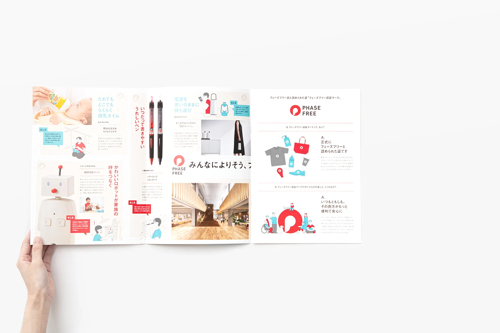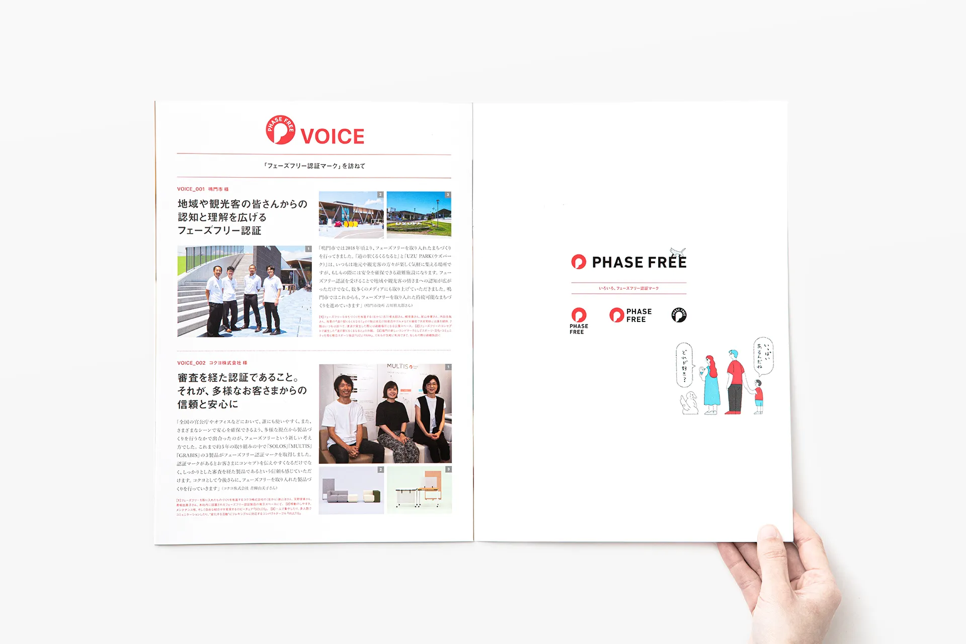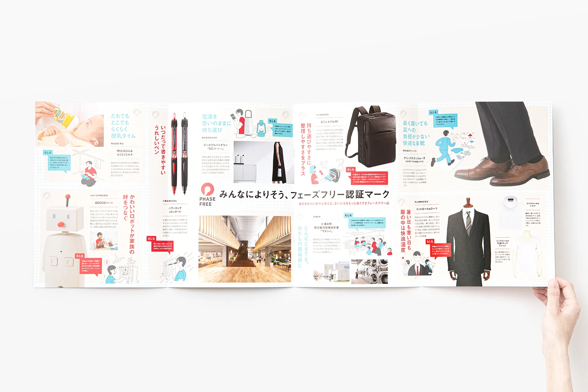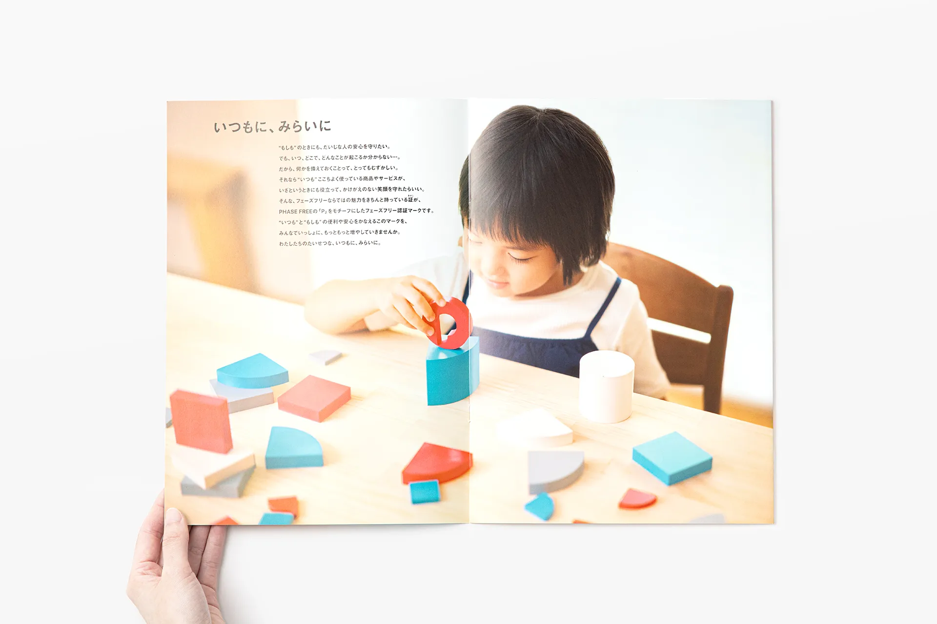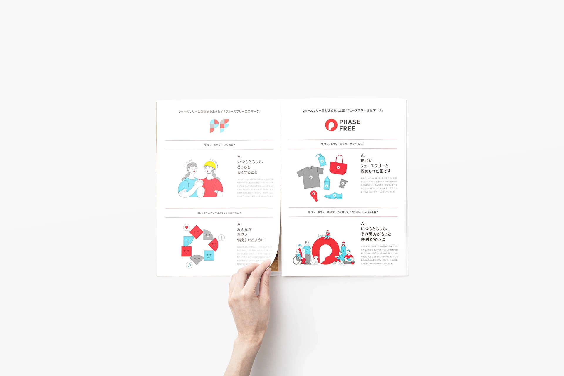 一般社団法人フェーズフリー協会が発行するパンフレットをデザインしました。フェーズフリー認証マークを印象付ける写真と、マークのコンセプトを易しく伝えるイラストレーションによって、協会がお届けしたい「安心」という価値が伝わることを心がけました。